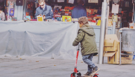 많은 사람들이 조깅을하고 공원에 있는 작은 서점에서 책들을 보고있었다.